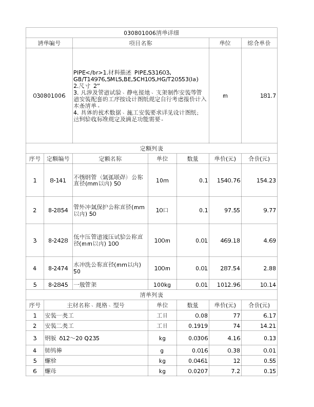 PIPE1.材料描述 PIPE,S31603, GB/T14976,SMLS,BE,SCH10S,HG/T20553(Ia) 2.尺寸 3” 3. 凡涉及管道试验、静电接地、支架制作安装等管道安装配套的工序按设计图纸规定自行考虑报价计入本条清单。 4. 具体的技术数据、施工安装要求详见设计图纸;达到验收标准规定及满足功能需要。