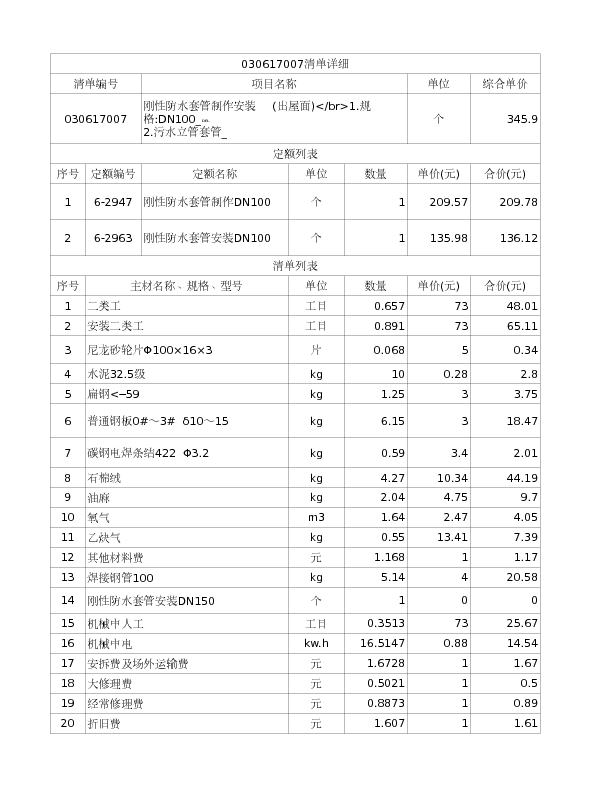 030617007 刚性防水套管制作安装 (出屋面)1.规格:DN100_