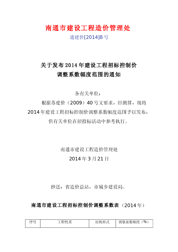 通建价[2014]8号 - 发布2014年建设工程招标控制价调整系数幅度范围