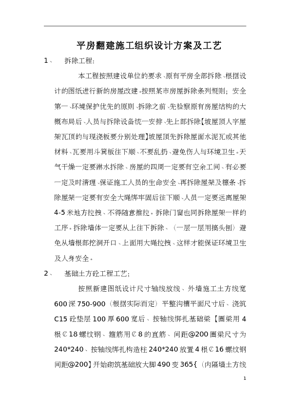 翻建房屋的施工组织设计整体方案,列出了地基混凝土施工工艺流程,砌体工程的施工流程,后期防水,毛坯装饰施工的工艺流程,地砖的铺设,后期管道铺设给排水暖通工程的安装,后期项目的验收依据等,是普通民房翻建的一个案例。