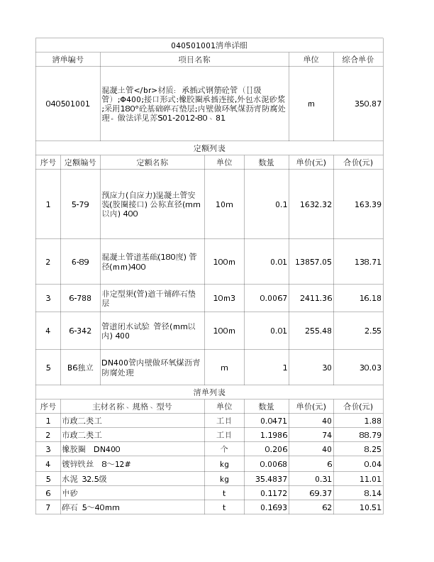 040501001 混凝土管材质:承插式钢筋砼管(Ⅱ级管);Φ800;接口形式:橡胶圈承插连接,外包水泥砂浆;采用180°砼基础碎石垫层。做法详见苏S01-2012-80、81
