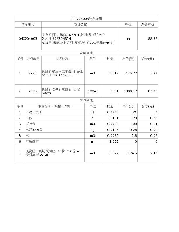 安砌侧(平、缘)石1.材料:五莲红路沿 2.尺寸:60*30*6CM 3.垫层,基础,材料品种,厚度,强度:C20砼基础4CM